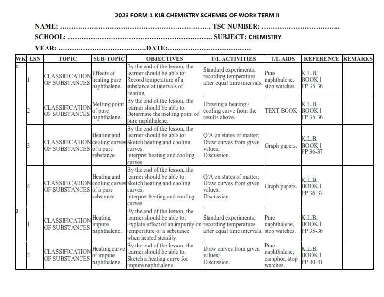 2023 FORM 1 KLB CHEMISTRY SCHEMES OF WORK TERM 2