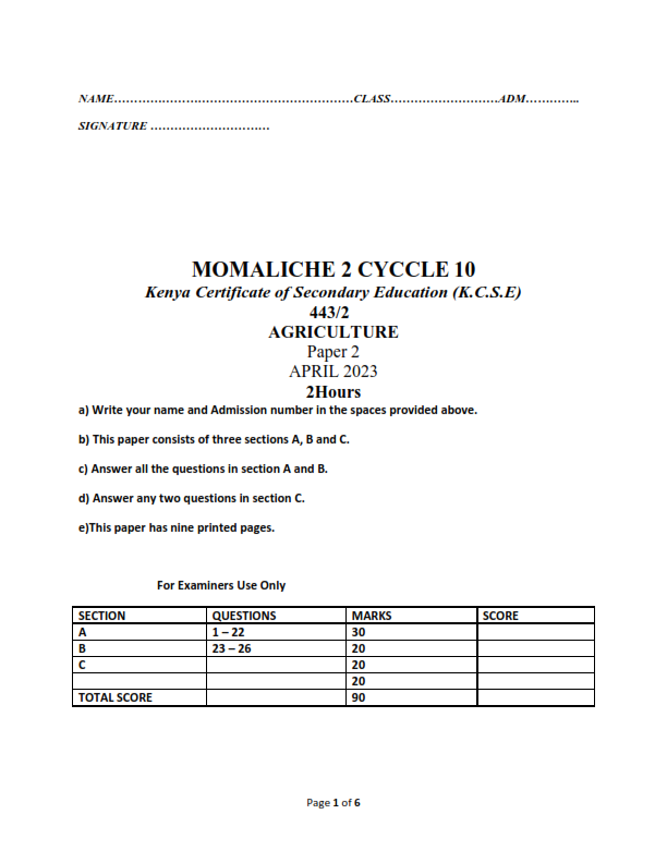 2023 FORM 4 AGRICULTURE MOMALICHE CYCLE 10 PAPER 1-2 PRE – MOCK EXAMS WITH MARKING SCHEMES