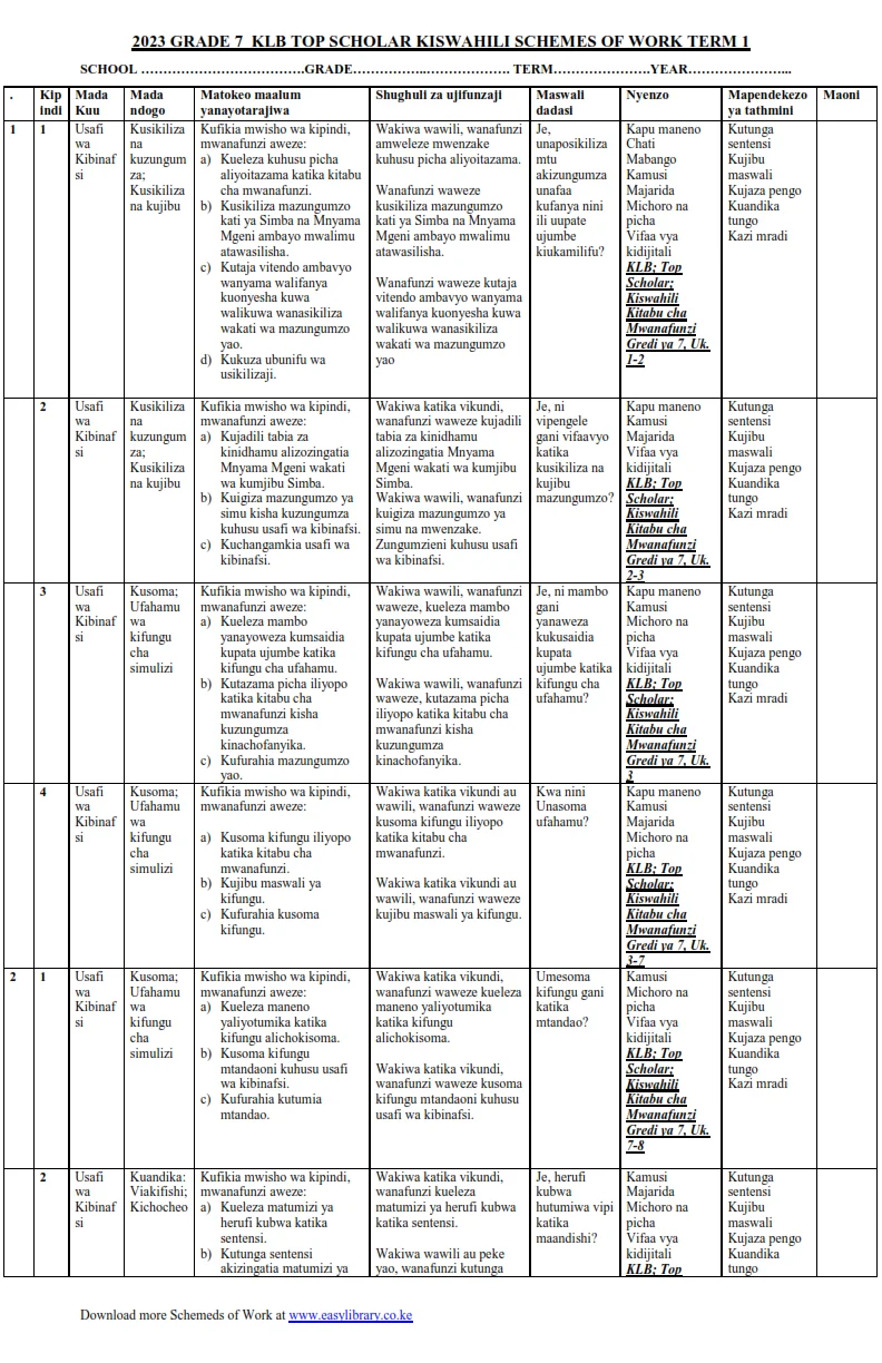 2023 GRADE 7 KLB TOP SCHOLAR KISWAHILI SCHEME OF WORK -TERM 1