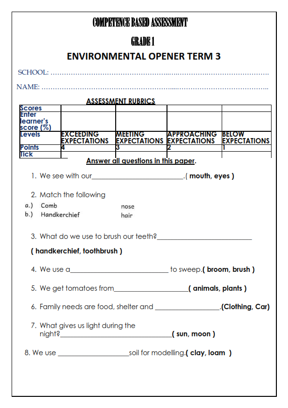2024 Grade 1 Term 3 Opener Exams with Marking Schemes (Zipped)