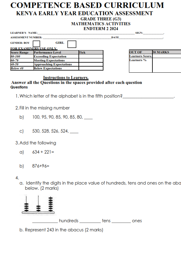 2024 GRADE 3 END TERM 2 EXAMINATIONS WITH MARKING SCHEMES – SET 1