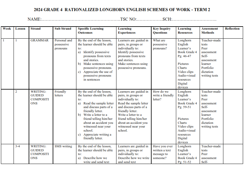 2024 GRADE 4 RATIONALIZED LONGHORN ENGLISH SCHEMES OF WORK – TERM 2