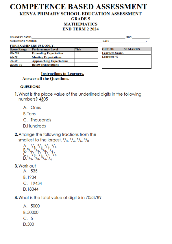 2024 Grade 5 End Term 2 Examinations with Marking Schemes – Set 1