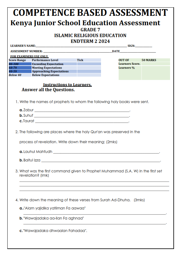 2024 GRADE 7 IRE END TERM 2 EXAMS WITH MARKING SCHEME