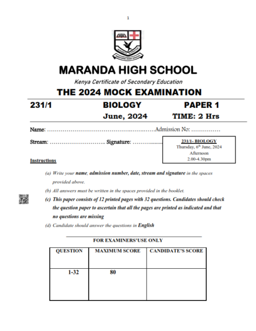 2024 MARANDA MOCK JUNE – BIOLOGY PAPER 1 -3 EXAM WITH MARKING SCHEMES