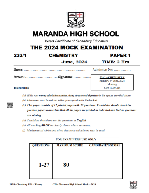 2024 MARANDA MOCK JUNE – CHEMISTRY PAPER 1 -3 EXAM WITH MARKING SCHEMES