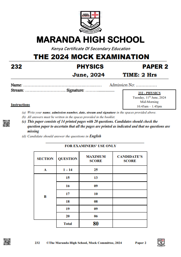 2024 MARANDA MOCK JUNE – PHYSICS PAPER 2-3 EXAM WITH MARKING SCHEMES