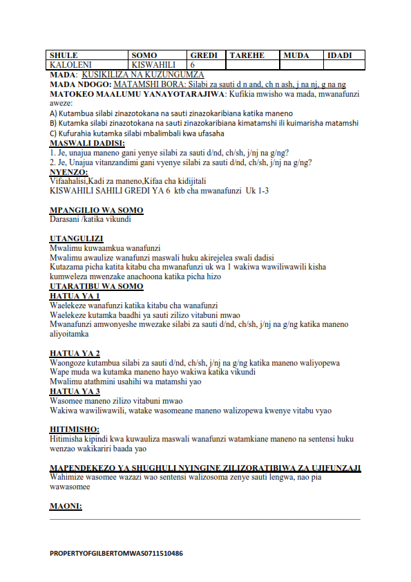 Grade 6 lesson Plan