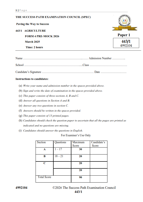 2026 FORM 4 SUCCESS PATH JOINT EXAM PRE-MOCK WITH MARKING SCHEMES
