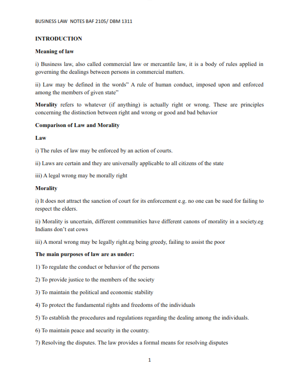 BAF 2105/ DBM 1311 BUSINESS LAW  NOTES -MOUNT KENYA UNIVERSITY
