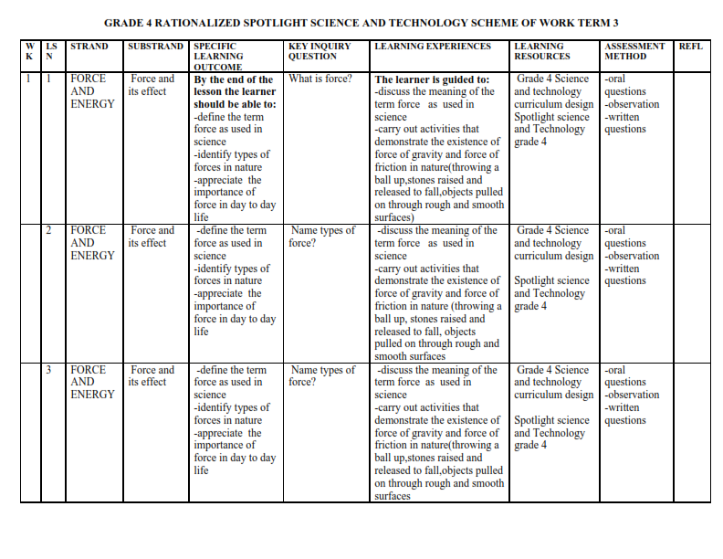 GRADE 4 RATIONALIZED SPOTLIGHT SCIENCE AND TECHNOLOGY SCHEME OF WORK TERM 3