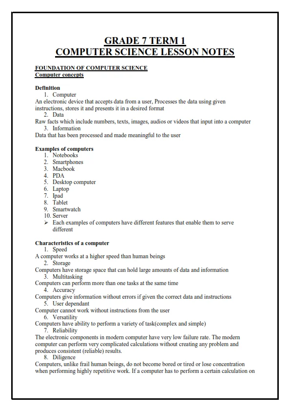 GRADE 7 COMPUTER SCIENCE LESSON NOTES-TERM 1